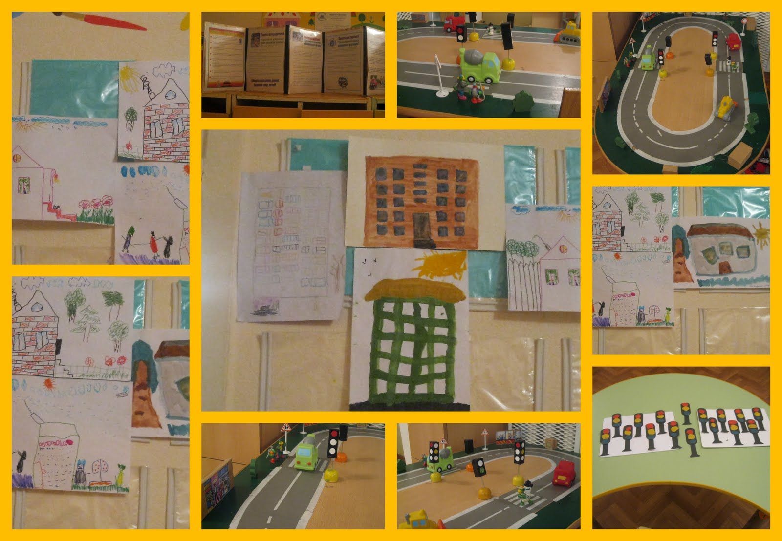 В рамках тематических недель "Моя улица", "Транспорт" дети получили знания о назначении различных зданий, о видах транспорта. Вместе с родителями дети нарисовали дома, в которых они живут. В группе они увидели работу действующего светофора, а также познакомились с перекрёстком, пешеходным переходом, с правилами дорожного движения.